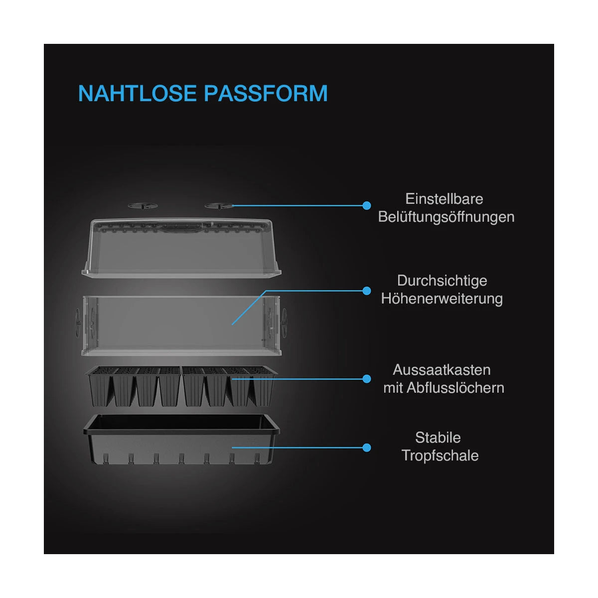 Dieses moderne Anzuchtset sorgt für ideale Keim- und Klonbedingungen. Die stabile, transparente Kuppel (3 mm Dicke) fördert eine gleichmäßige Luftfeuchte und gleichzeitig optimale Lichtdurchlässigkeit. Dank der Höhenverlängerung und verstellbarer Ventilschlitze kannst du das Mikroklima problemlos anpassen.